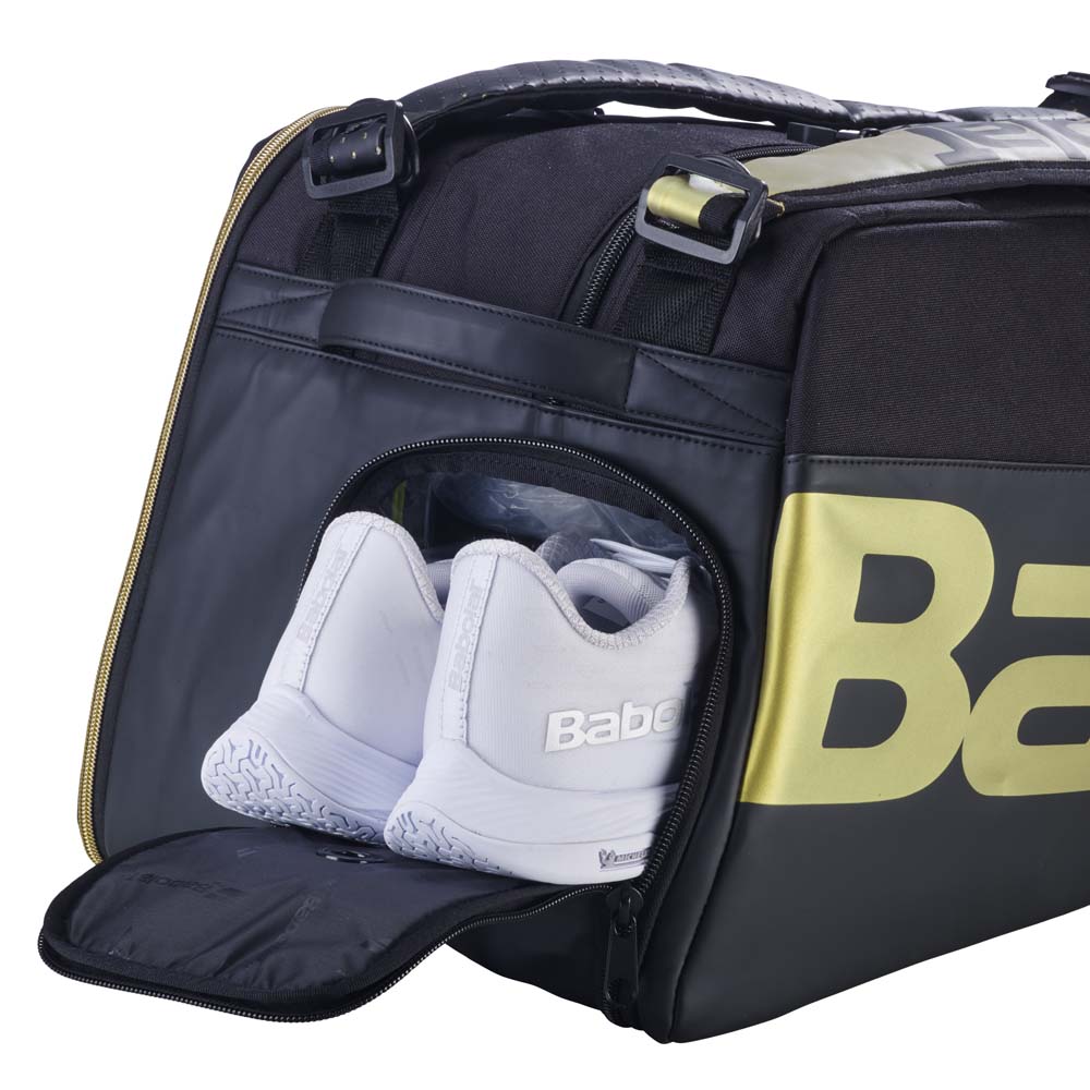 The Babolat Cross Pro is a premium, high-capacity badminton bag designed for organisation-obsessed players who travel by bike or public transport and need maximum equipment protection. Finished in a black and gold colourway, the bag is built to be robust and ergonomic, ensuring it remains comfortable to carry even when fully loaded.