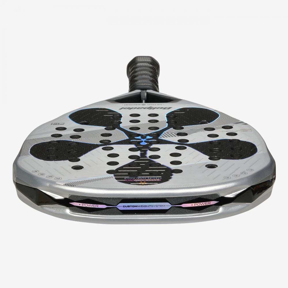 Bullpadel describes it as their most precise racket ever created, built for those who aim to decide the outcome of the Premier Padel Final. Key technical specifications include an approximate weight of 365-375 grams and a head heavy balance. The exterior composition is X-Tend Carbon 3K, the interior is Multieva, and it features a 3D-type rough finish. Notable technologies beyond the core materials include Neuron Core, Air Power, Custom Weight, and Hesacore.