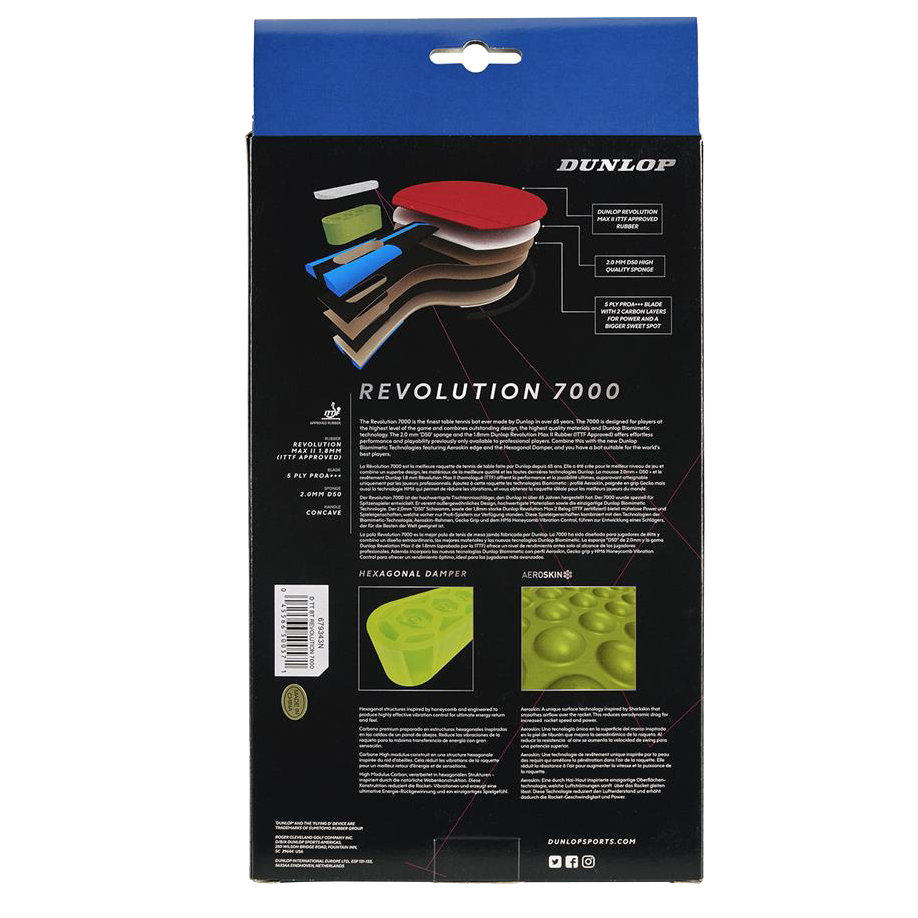The Revolution 7000 is the finest table tennis bat ever made by Dunlop in over 65 years. The 7000 is designed for players at the highest level of the game and combines outstanding design and the highest quality materials. The 2.0 mm ‘D50’ sponge and the 1.8mm Dunlop Revolution Max II Rubber (ITTF Approved) offers effortless performance and playability previously only available to professional players. Combine this with Aeroskin edge and the Hexagonal Damper, and you have a racket suitable for the world’s best players.