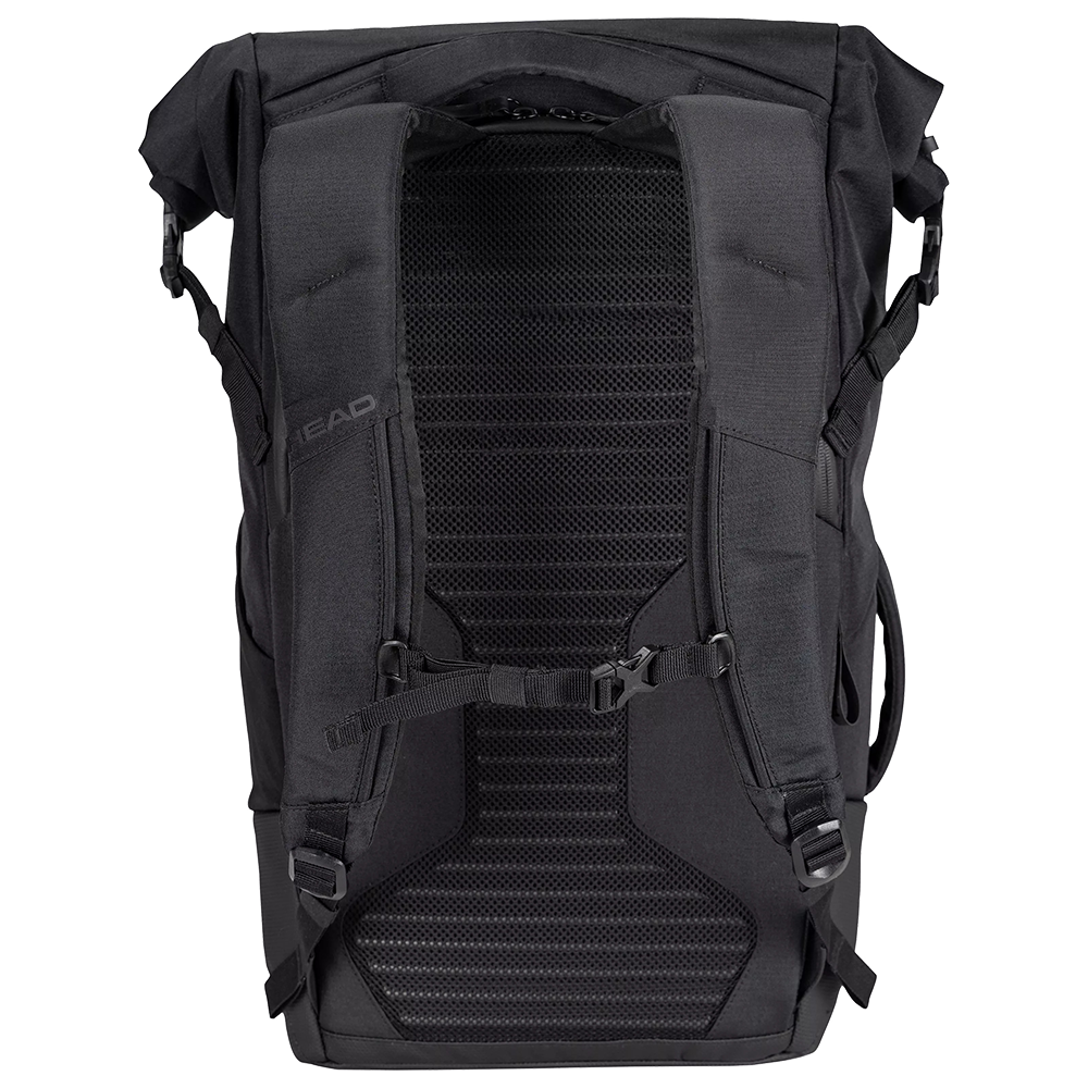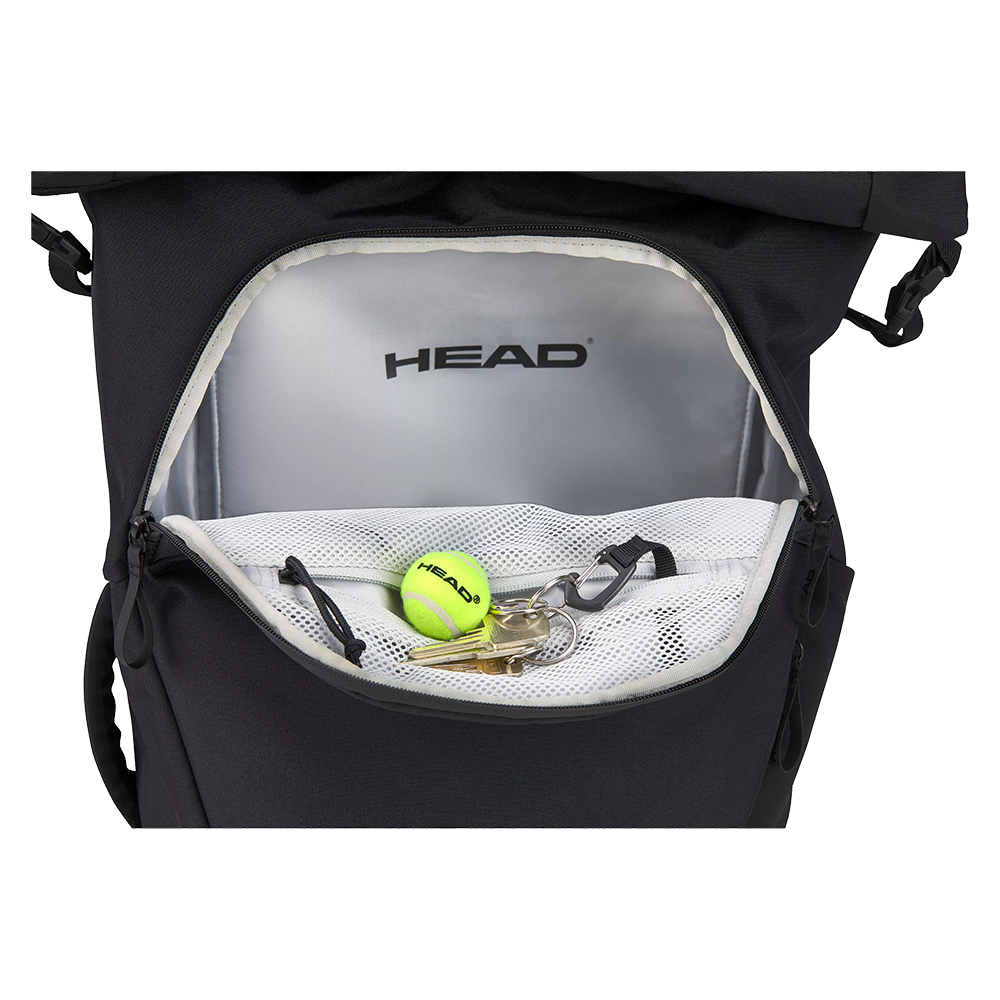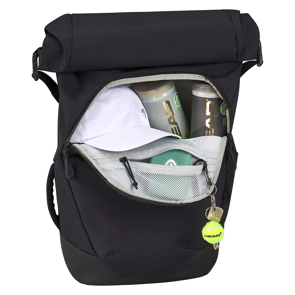 It features a roll-top design, accessory pockets, a laptop compartment, and space for up to 3 racquets (Tennis, Padel, Squash, Pickleball, Badminton, or Racketball) with CCT+ climate control technology.