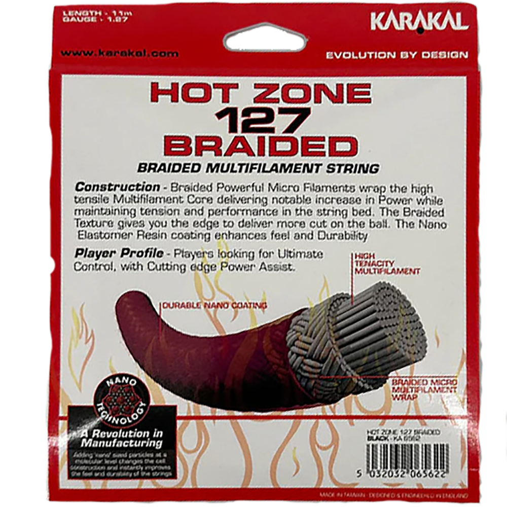 The Karakal Hot Zone 127 is a braided, multifilament string that has been specially developed for both Squash and Racketball.