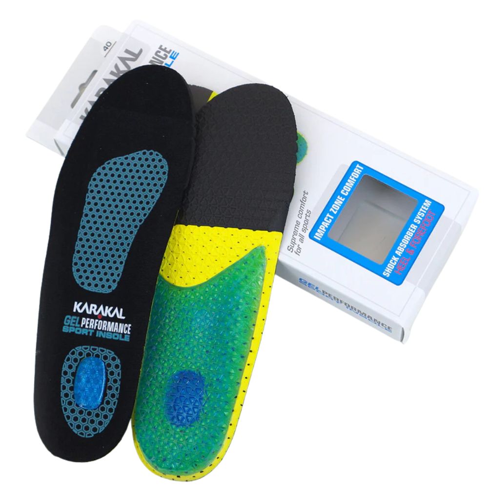 The Karakal GEL Performance Sport Insole provides a comfortable, practical and supportive base for your foot during the rigours of almost any sport. GEL impact zone pads at the Heel and Arch plus Air chambers, provide exceptional comfort. Fitted with Karakal Shock Absorbent Silicone GEL, this sport insole provides cushioning for energy rebound and added performance. Whilst the sweat absorbent breathable mesh surface layer, increases the foot’s ability to breathe and provides an unparalleled level of comfort. The Karakal GEL Performance Sport Insole is designed to give strong foot support and provide stability with its inbuilt control device to centre the foot, providing comfort and flexibility.
