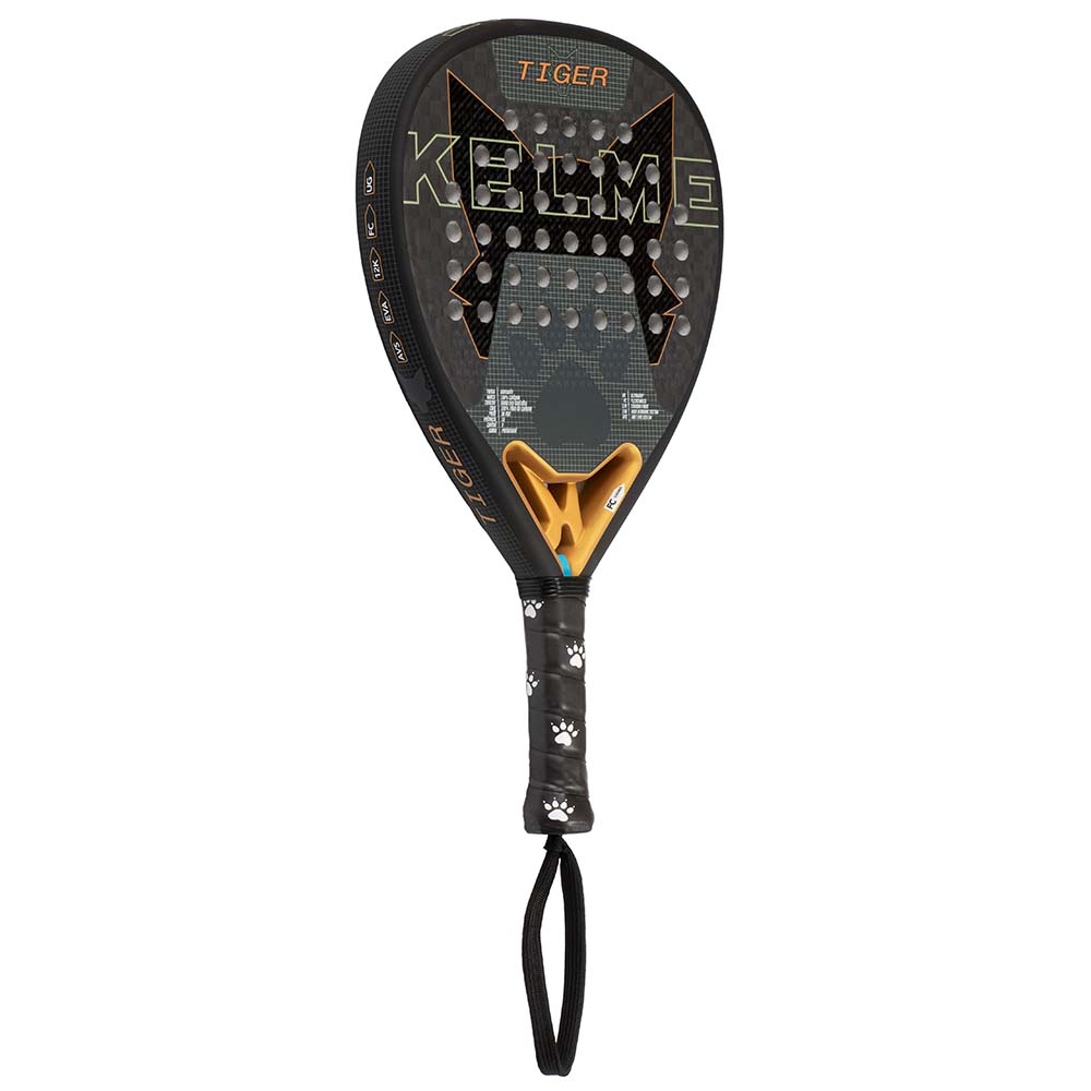 The Kelme Tiger Padel Racket (2025) is designed for advanced players who require a perfect balance between power and control. This racket features a teardrop shape and is built with a 100% Carbon Fibre frame and 100% Carbon Fibre faces utilising 12K Carbon for a solid feel and excellent ball output. The core is made with Premium Eva rubber, ensuring quality performance and feel during play