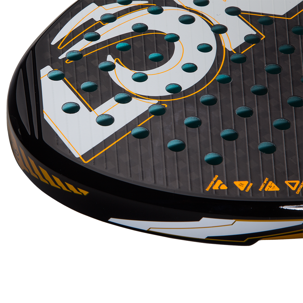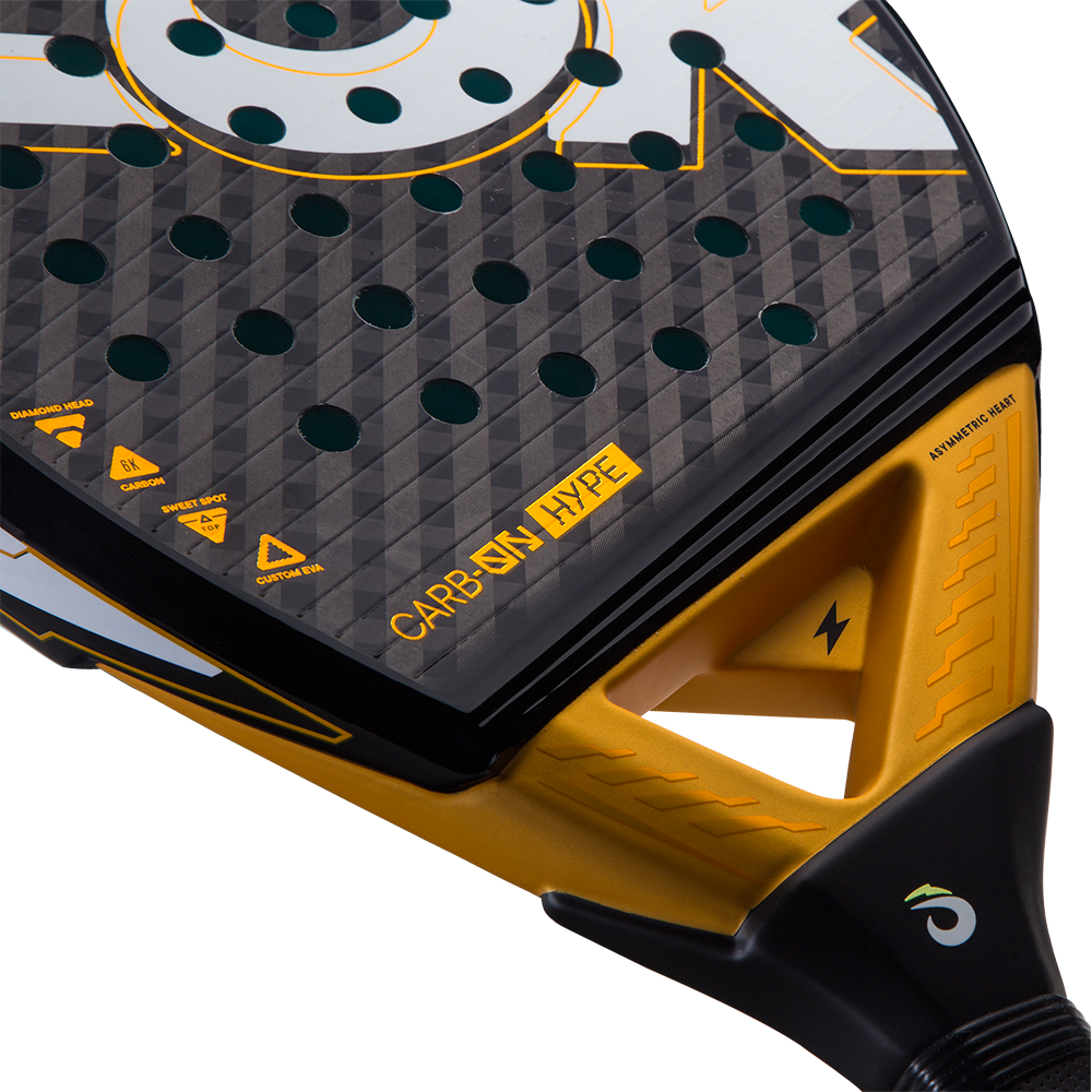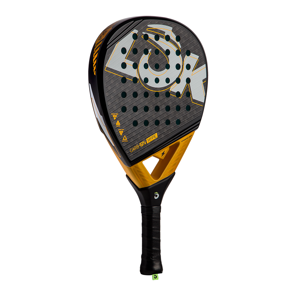 The Carb-On Hype racket is a cutting-edge choice for skilled padel enthusiasts, offering an ideal blend of power and precision. Its innovative design incorporates advanced technologies to elevate performance. A notable feature is the asymmetric core, optimizing weight distribution for enhanced manoeuvrability and stability with every swing. With a C6 Carbon surface arranged in three layers, it delivers remarkable power. The Gradual Face system minimizes vibration upon impact, ensuring a smooth experience. Exclusive 3D Spin Lines increase ball rotation, while the Dynamic Holes System enhances shot power through varied hole sizes. Carbon reinforcements fortify its structure, while the Comfort Wristband provides customizable wrist support. Its diamond shape prioritizes attacking prowess with a top-focused balance and sweet spot.