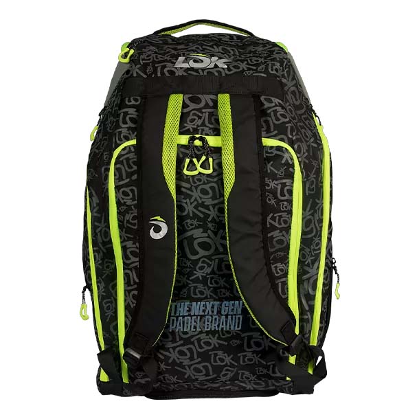 The LÕK Maxx Gen 2 in the Black/Lime Green colourway is a high-volume professional racket bag. It is designed for players who need maximum storage capacity without sacrificing gear protection or carrying comfort.