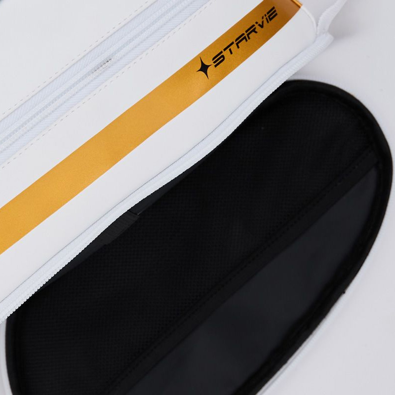 The STARVIE Skyline padel washbag stands out with its sporty white design with golden stripe and black details. It offers a large central compartment along with two side pockets, perfect for storing accessories or everyday essentials. The ideal complement for those who value organization without giving up a stylish and functional design.