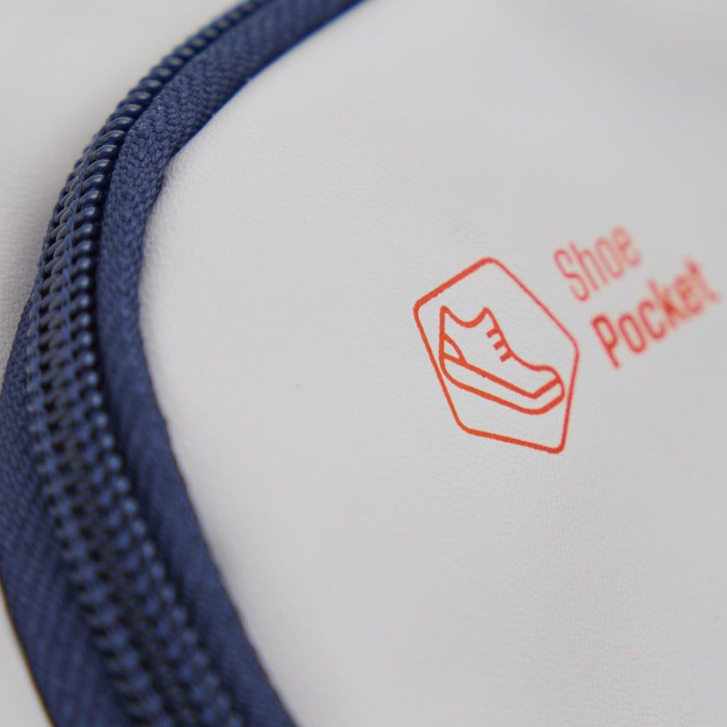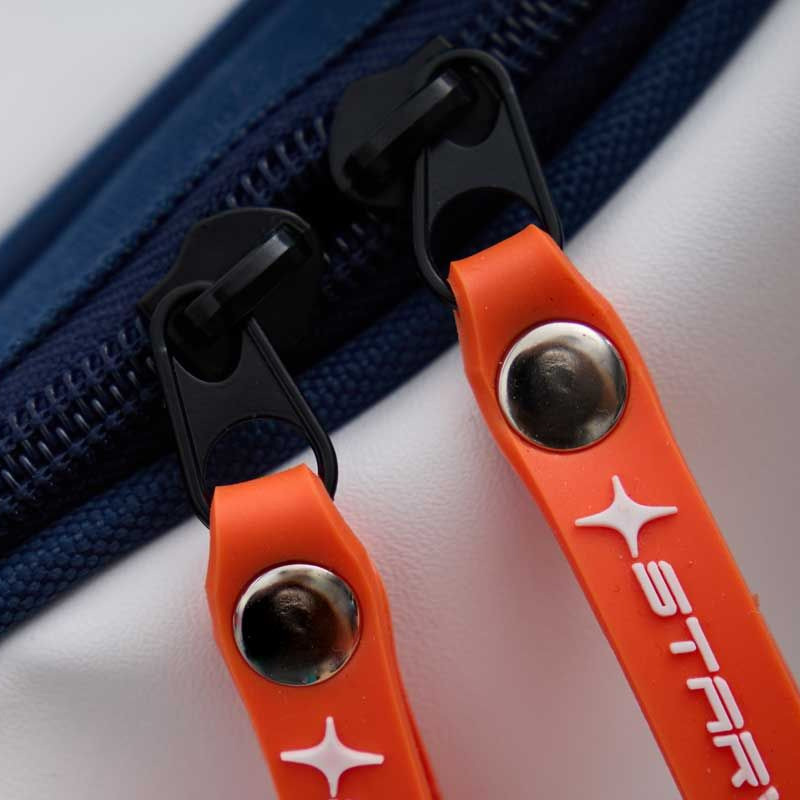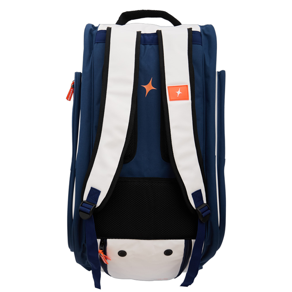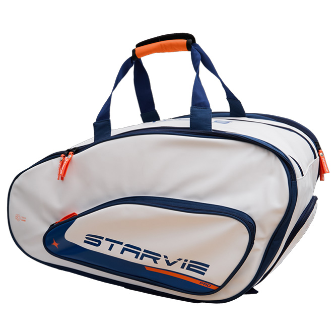 The Starvie Tactic Pro padel bag is a spacious and comfortable bag for padel players. It has a modern design in white, navy, and orange. The bag features two Thermotech racket compartments to protect rackets from extreme temperatures, a separate ventilated shoe compartment, and a dedicated pocket for a ball canister. It offers a dual carrying system with padded handles and backpack straps for easy transport. The bag measures 60 x 34 x 33 cm and is made from PV Leather and Polyester.