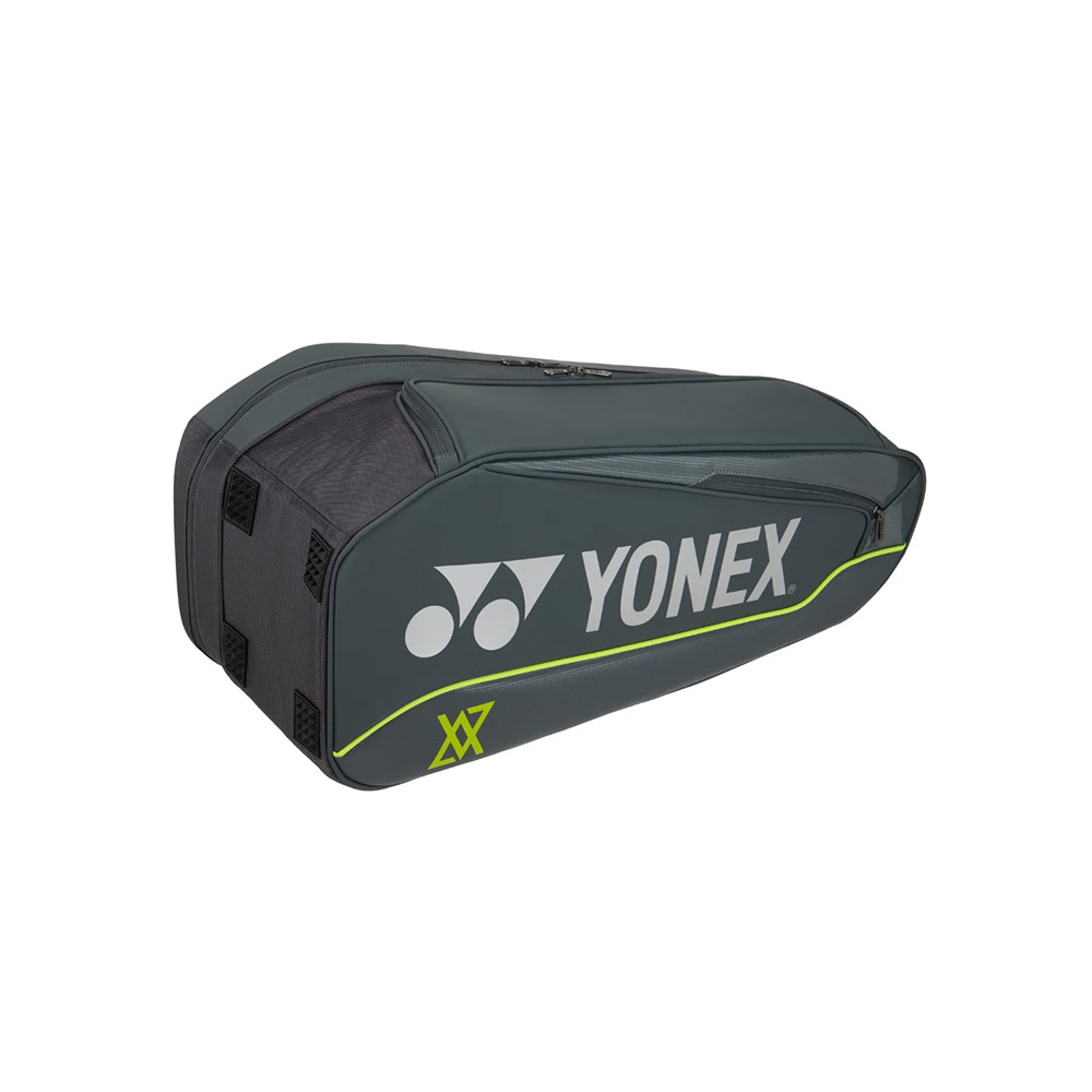 The Yonex Expert Racket Bag VA is a tour-grade bag designed in collaboration with world champion Viktor Axelsen. It has a 6-racket capacity with spacious compartments for gear, and is built from a durable polyester and PU blend. The bag features a thermal lining to protect rackets and strings from variable temperatures wherever you’re playing. A separate compartment for shoes, and an external pocket for accessories are handy ways to store ancillary items. It also offers comfortable carrying options with padded backpack straps and top handles. The bag’s design is a signature dark grey with neon lime accents, matching Axelsen’s gear.